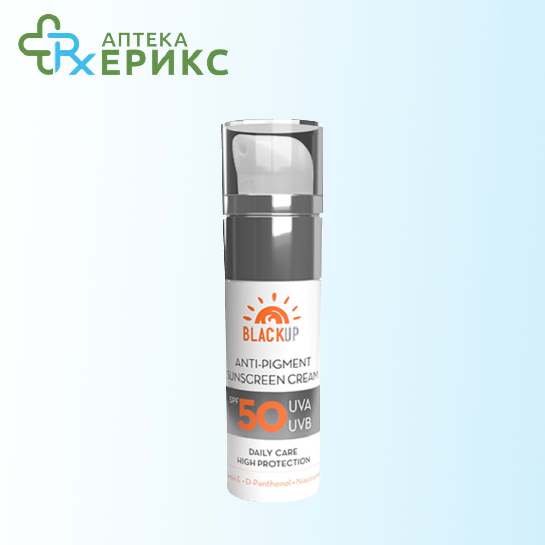 Антипигментен крем Black Up со СПФ50 – Кремот Black up со заштитен фактор 50 и со антипигментен ефект, кој е наменет за дневна нега, овозможува висока заштита на кожата од штетното УВ-зрачење при секојдневното изложување на сонце, особено во летниот период. Комплексната формулација на кремот се заснова на употреба на висококвалитетни фотостабилни хемиски УВ-филтри со широк спектар на дејство, кои ги апсорбираат сончевите УВА- и УВБ-зраци. Моќниот комплекс од активни состојки, меѓу кои нијацинамидот и екстрактот од алое вера, помага во намалувањето на големината на пигментните дамки и во спречувањето појава на нови.