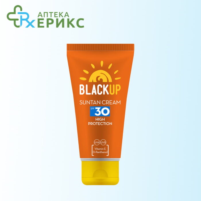 Black Up Крем за сончање СПФ 30 – Содржи комбинација на УВА- и УВБ-филтри, масла, витамин Е, Де-пантенол и на ши-путер.