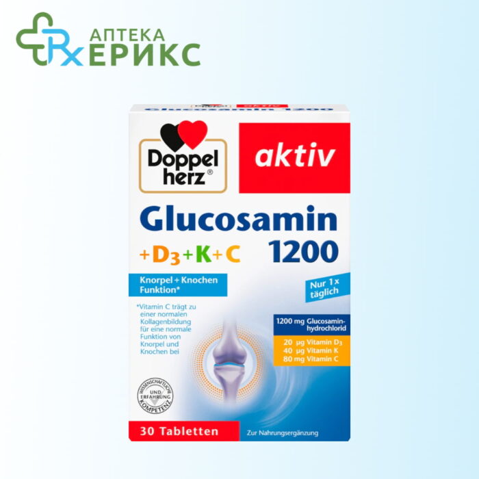 Doppelherz Glucosamine 1200 содржи витамин Ц, витамин Е, витамин К и витамин Д. Содржи и 1200 mg глукозамин хидрохлорид – во само 1 таблета.
