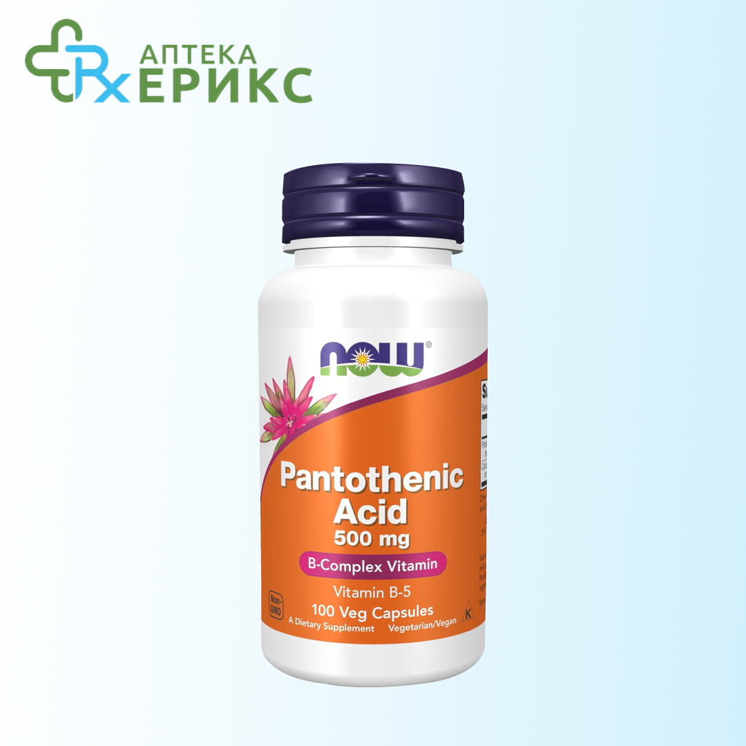 NOW Pantothenic acid капсули – Пантотенска киселина (витамин B5) е витамин од Б-комплексот кој учествува во создавање на енергија и метаболизам на масти, јаглехидрати и протеини. Се користи за поддршка на нервниот систем, намалување на замор и одржување на здрава кожа и коса.