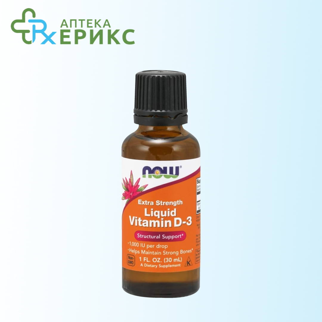 NOW Vitamin D3 1000 IU капки – Vitamin D е клучен витамин во високо апсорблива течна форма на маслен раствор. Витаминот Д нормално се добива од исхраната или се продуцира од кожата од ултравиолетовата енергија на сонцето. Бидејќи многу луѓе избегнуваат изложување на сонце, суплементацијата на витамин Д станува се понеопходна за да се осигура дека организмот ја добива соодветната количина.